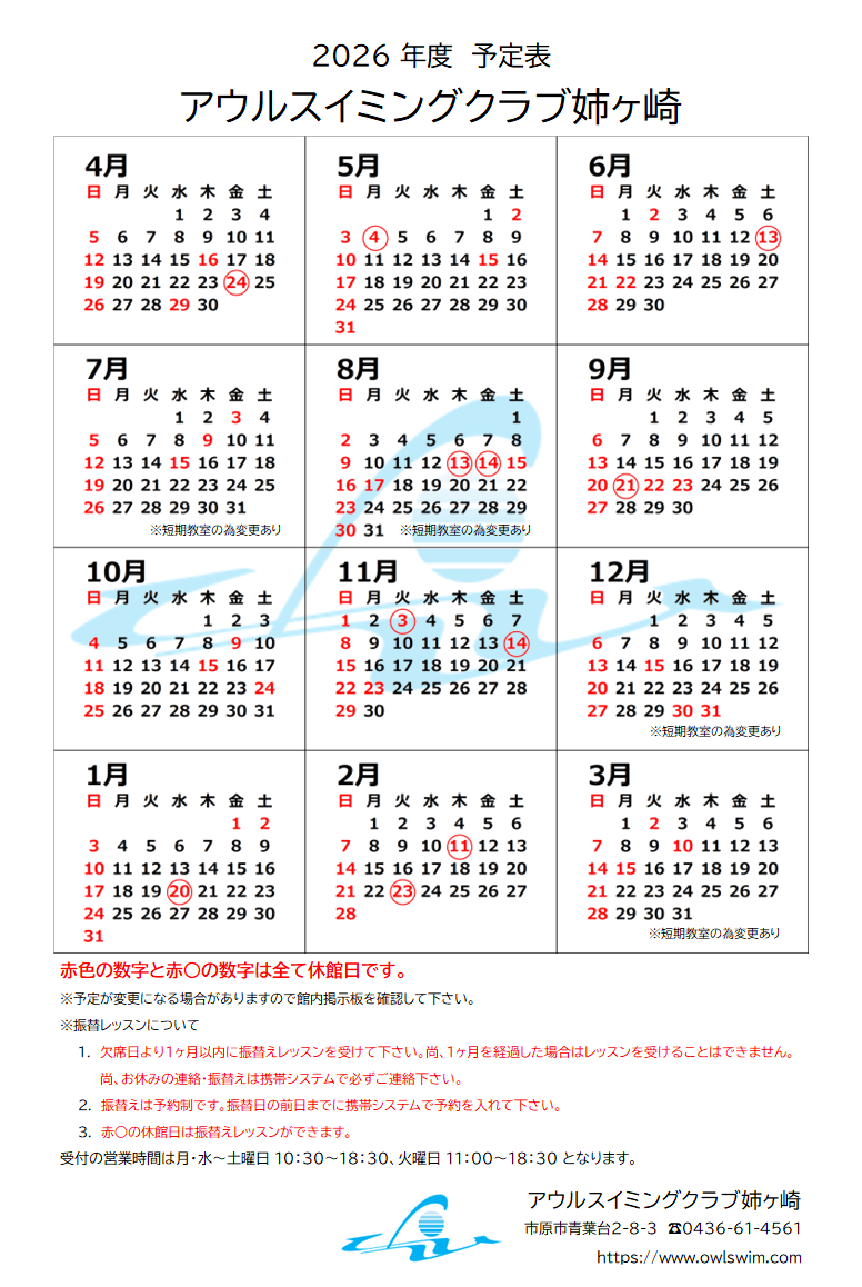 ・総合プールプログラム・料金表のダウンロードはこちらから(PDF) ・ 子どもスクールスケジュールのダウンロードはこちらから(PDF) ・ スクールバス運行時刻表のダウンロードはこちらから(PDF) ・ 2026年度予定表のダウンロードはこちらから(PDF)