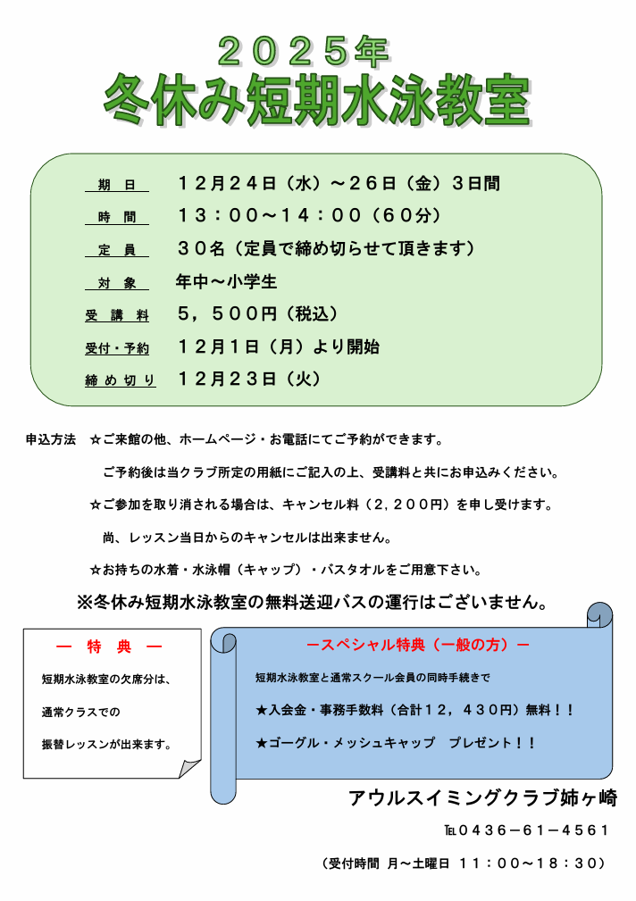 12月1日(月)から冬休み短期水泳教室の受付を開始します! 会員様もビジター様もご参加お待ちしております! 冬休み短期水泳教室の詳細はコチラから♪♪